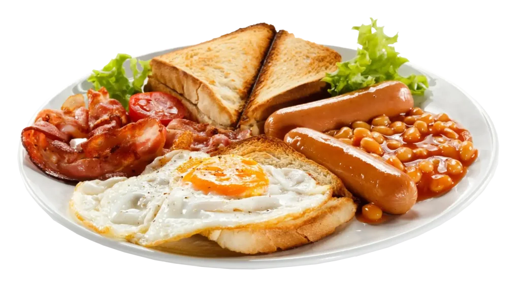 Pancakes/Waffle/French Toast, eggs, sausages, bacon, beans.